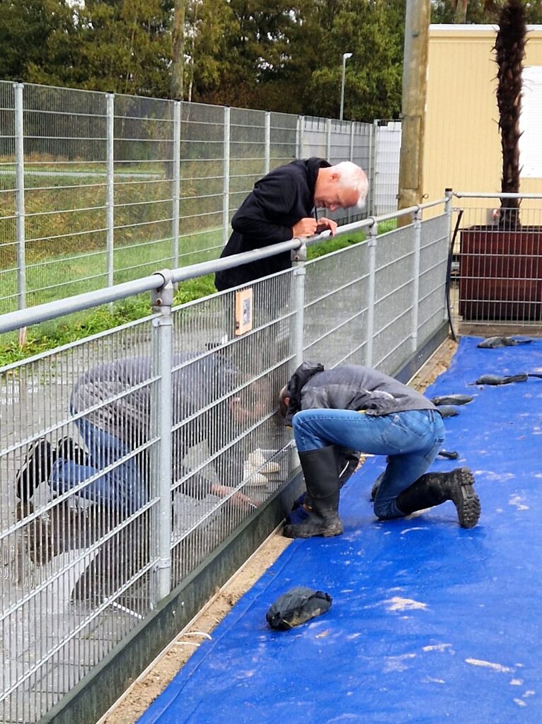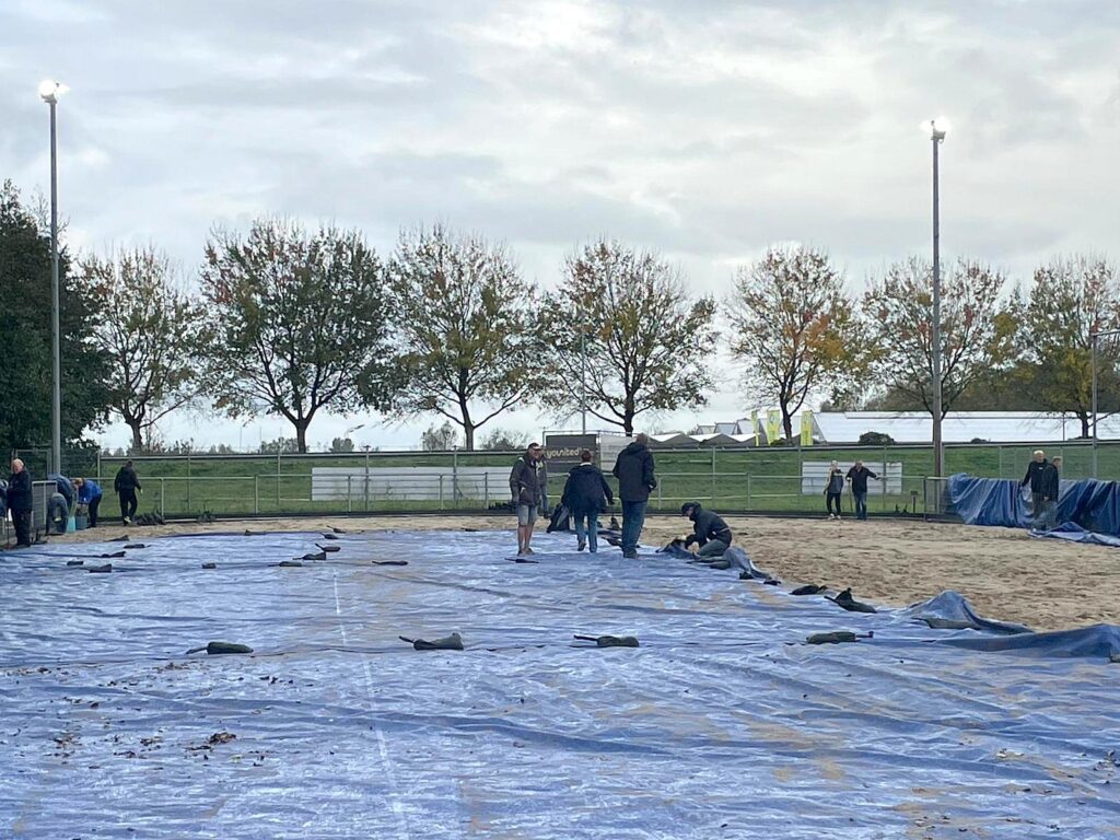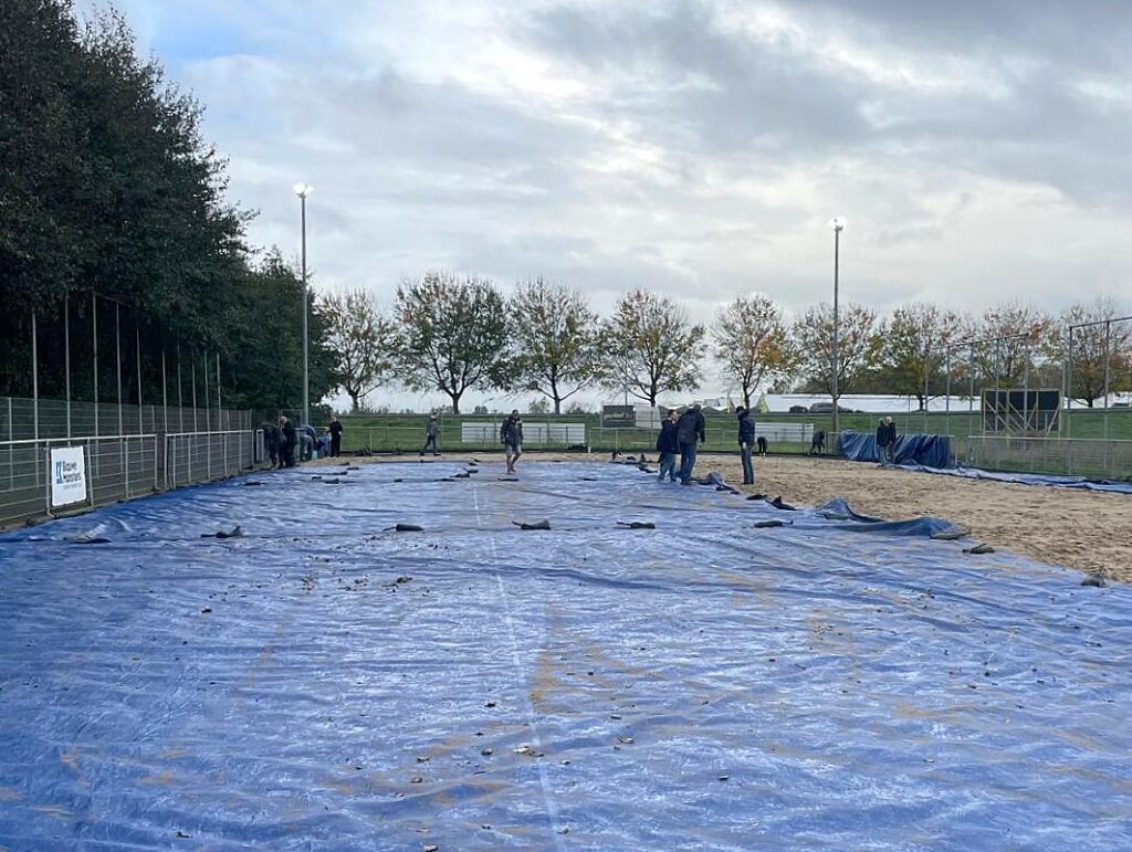 Omdat deze week is gestart met het aanbrengen van planken rond de velden (door de gemeente) ontbraken er bij alle blauwe zeilen de tie wraps die de boel op hun plaats houden. Deze zijn opnieuw aangebracht. (Overigens zijn de planken tegen het verwaaien van het zand dus weer een verbetering van onze velden).